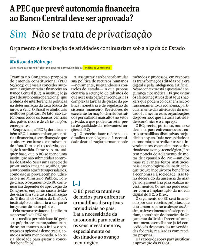 A PEC que prevê autonomia financeira ao Banco Central deve ser aprovada? – Folha de São Paulo