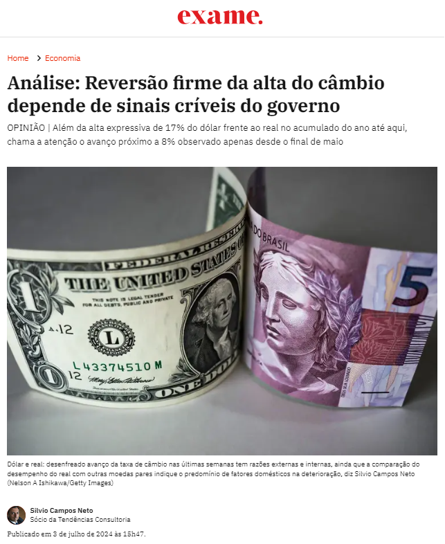 O desenfreado avanço da taxa de câmbio nas últimas semanas é o tema de maior destaque nos mercados financeiros neste momento no Brasil. De fato, além da alta expressiva de 17% do dólar frente ao real no acumulado do ano até aqui, considerando o fechamento de 2023 em R$ 4,84/US$ e a PTAX em 2 de julho de R$ 5,66/US$, chama a atenção o avanço próximo a 8% observado apenas desde o final de maio.
