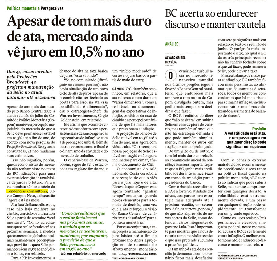 Com o risco de recessão nos EUA e a forte volatilidade dos ativos, essa parece ser a estratégia mais adequada até a próxima reunião, em setembro. A única certeza, por ora, é de que não há previsão de novos cortes da Selic, como defendem vários integrantes do governo Lula. Isso é importante para mostrar que a nova diretoria tem uma visão técnica e que não pretende sucumbir a pressões políticas.