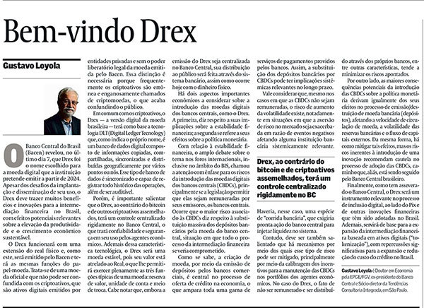 Finalmente, como tem asseverado o Banco Central, o Drex será um instrumento relevante no processo de inclusão digital, ao lado do Pix e de outras inovações financeiras que têm sido adotadas no Brasil. Ademais, servirá de base para a expansão da intermediação financeira baseada em ativos digitais (“tokenização”), com repercussões significativas para a expansão e redução do custo do crédito no Brasil.