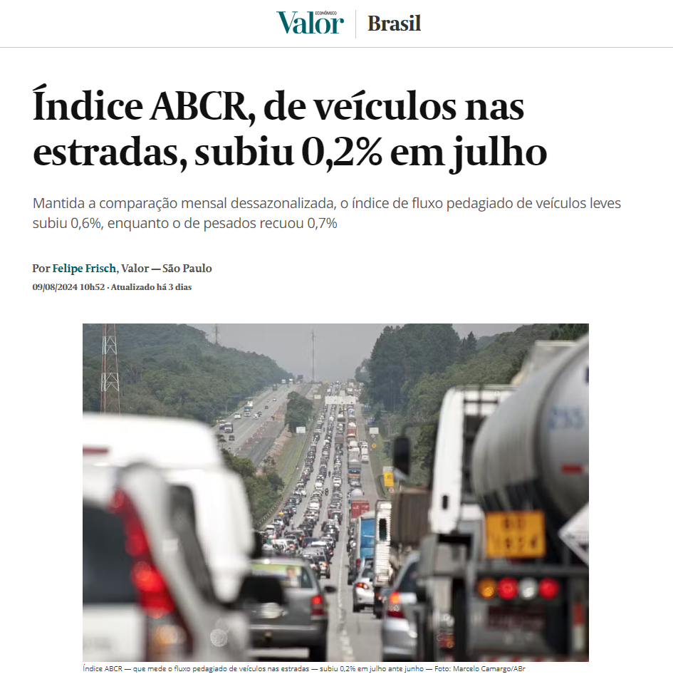 O Índice ABCR – que mede o fluxo pedagiado de veículos nas estradas – subiu 0,2% em julho ante junho, considerando os dados dessazonalizados, informou a Associação Brasileira de Concessionárias de Rodovias (ABCR), responsável pelo levantamento, em parceria com a Tendências Consultoria.