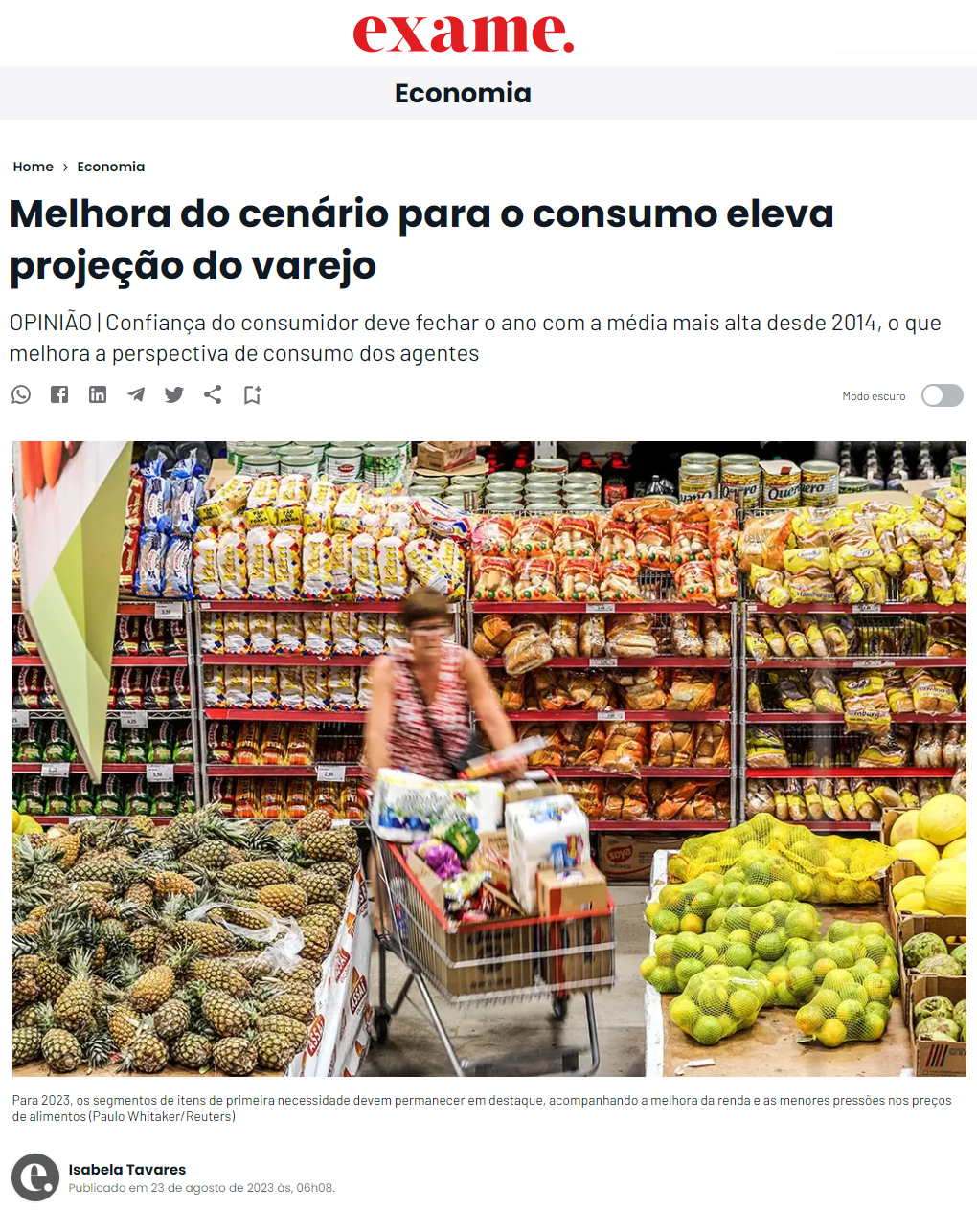No segundo semestre deste ano, os fatores mencionados devem continuar a beneficiar o consumo. O cenário dos condicionantes considera avanços adicionais da massa de rendimentos das famílias, por meio de transferências do governo, ganhos da renda do trabalho e continuidade no arrefecimento dos preços de alimentos e de bens industrializados. Além disso, a confiança do consumidor deve fechar o ano com a média mais alta desde 2014, o que melhora a perspectiva de consumo dos agentes.