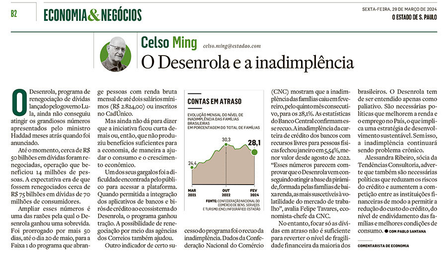 Outro indicador de certo sucesso do programa foi o recuo da inadimplência. Dados da Confederação Nacional do Comércio (CNC) mostram que a inadimplência das famílias caiu em fevereiro, pelo quinto mês consecutivo, para os 28,1%. As estatísticas do Banco Central confirmam esse recuo. A inadimplência da carteira de crédito dos bancos com recursos livres para pessoas físicas fechou janeiro em 5,54%, menor valor desde agosto de 2022.