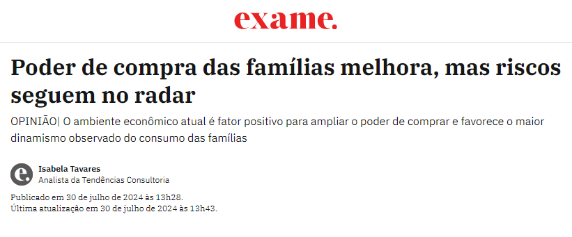 O poder de compra das famílias tem exibido trajetória de crescimento em função do cenário de melhora da situação financeira das famílias e do mercado de trabalho aquecido. O ambiente econômico atual, marcado por maior qualidade na carteira de crédito, menores riscos de inadimplência, redução dos juros bancários e crescimento da massa de renda, é fator positivo para ampliar o poder de compra e favorece o maior dinamismo observado do consumo das famílias. No entanto, fatores de riscos seguem no radar e limitam a aceleração do poder de compra no curto prazo, considerando a) inflação de alimentos pressionada e b) as incertezas do cenário doméstico.