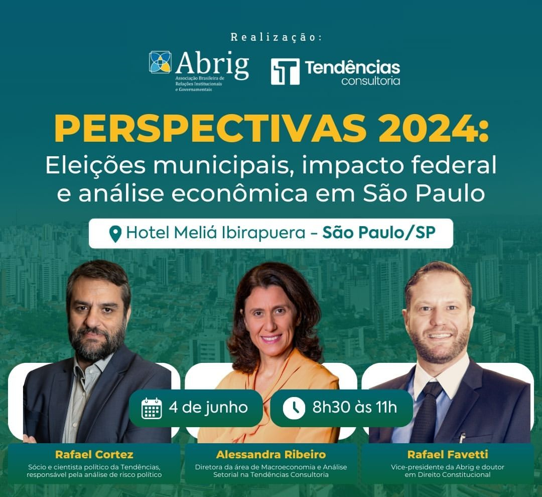 Na manhã do dia 4 de junho, a Tendências Consultoria realizou um evento exclusivo para clientes em parceria com a Associação Brasileira de Relações Institucionais e Governamentais (Abrig). Ele aconteceu no hotel Meliá Ibirapuera, em São Paulo, e contou com as presenças de Alessandra Ribeiro (sócia e diretora da área de Macroeconomia e Análise Setorial da Tendências), Rafael Cortez (sócio e cientista político da Tendências, responsável pela análise de risco político) e Rafael Favetti (vice-presidente da Abrig e doutor em Direito Constitucional).