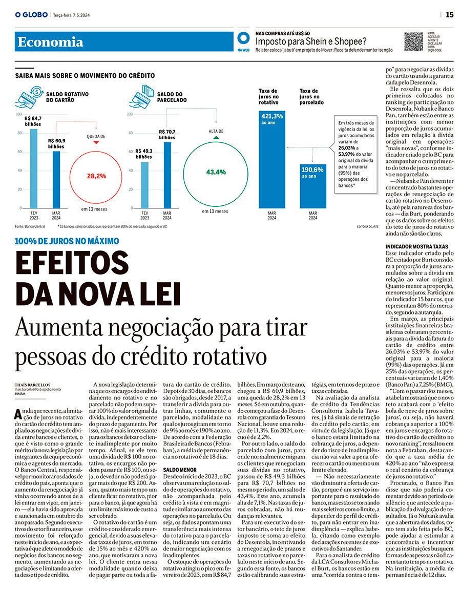 — Nubank e Pan devem ter concentrado bastantes operações de renegociação de cartão rotativo no Desenrola, até pela natureza dos bancos — diz Burt, ponderando que os dados sobre os efeitos do teto de juros do rotativo ainda não são tão claros.