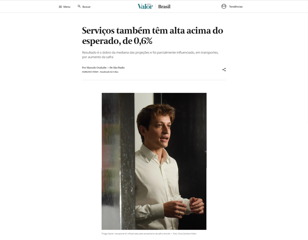 Matéria do Valor Econômico dá destaque para a análise de Thiago Xavier, economista da Tendências, sobre a alta do setor de serviços no primeiro trimestre de 2023. O analista atribui o bom desempenho à safra recorde da agricultura, à recuperação do mercado de trabalho formal e à maior busca por viagens no contexto de normalização do pós-pandemia, entre outros motivos.